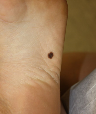 Melanoma with characteristic asymmetry, border irregularity, color variation, and large diameter.