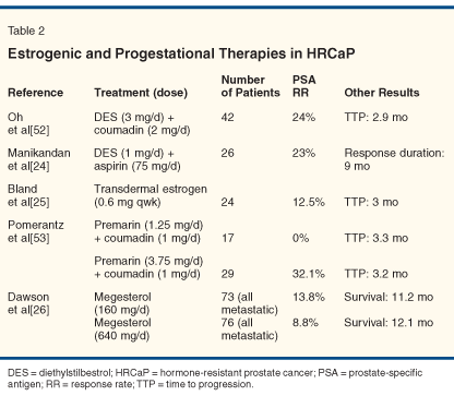 • Estrogens and Progestins-Estrogens and progestins have long been known to have an inhibitory effect on CaP, although through unclear mechanisms. Diethylstilbestrol (DES, a synthetic estrogen) has been studied extensively in hormone-sensitive CaP and found to be efficacious (in part, by lowering serum testosterone to castrate levels) but associated with lethal cardiovascular events. In the HRCaP setting, a small (58-patient) randomized trial compared 1 mg/d of DES to bicalutamide and found a similar PSA response rate (23 vs 31%, respectively), but again, revealed cardiovascular toxicity in the DES group.[24]