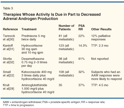 • P450 Enzyme Inhibitors-The adrenal glands produce up to 30% of androgenic steroids. These adrenal androgens are not affected by primary androgen deprivation therapy and may contribute to progression to the hormone-refractory state. Thus, several different approaches have been evaluated to eliminate adrenal androgens (Table 3), including adrenalectomy and treatment with ketoconazole and aminoglutethimide. Ketoconazole, an imidazole antifungal that is also a potent CYP3A4 inhibitor, is the most studied. Treatment with ketoconazole results in marked decreases in circulating adrenal androgens but can also result in adrenal insufficiency. Therefore, ketoconazole treatment (particularly in high doses) is usually accompanied by steroid supplementation (which also has activity in HRCaP).