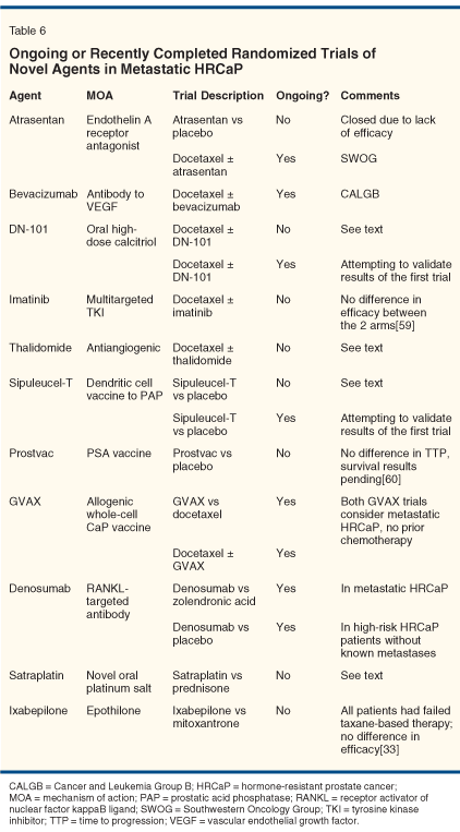There is a fair amount of excitement in the CaP community for several novel therapeutic approaches that are now in the clinic. These approaches include novel chemotherapeutics, mammalian target of rapamycin (mTOR) inhibition, inhibitors of histone deacetylase, immunomodulatory therapies, antiangiogenic therapies, endothelin-receptor antagonists, and inhibitors of heat shock protein 90. Below, we will focus on novel approaches that are showing promise in late-stage clinical trials.