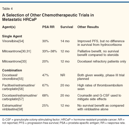 Multiple other chemotherapeutic agents have been evaluated in metastatic HRCaP, although none to date are associated with a survival benefit (see Table 4). Randomized trials have been rare, and patient populations may differ by whether they had already received docetaxel. It is expected that responses rates in the post-docetaxel setting will be less impressive.[33,34] While some of the response and survival data from the multiagent first-line studies is promising, phase III trials are needed before these regimens can be incorporated into standard practice.