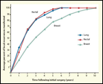 The absolute rates of LRF for patients with breast, lung, and rectal cancers are shown in Figures 2A, 3A, and 4A. Graphs illustrating the percent of LRFs manifest over time are shown in Figures 2B, 3B, and 4B. Note that the curves in Figures 2B, 3B, and 4B all reach 100%. The weighted averages for the data from the different diseases are shown in Figure 5.