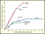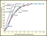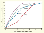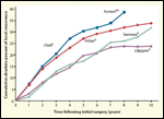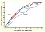 The maximum reported cumulative LRF rate was noted (essentially that at the longest post-surgery time point with an associated LRF rate). At each time point, the percent of LRFs manifest by that time was calculated (ie, reported LRF rate / maximum LRF rate). This approach essentially renormalized each of the individual cumulative failure rate graphs to a maximum of 100% (Figures 2B, 3B, 4B).