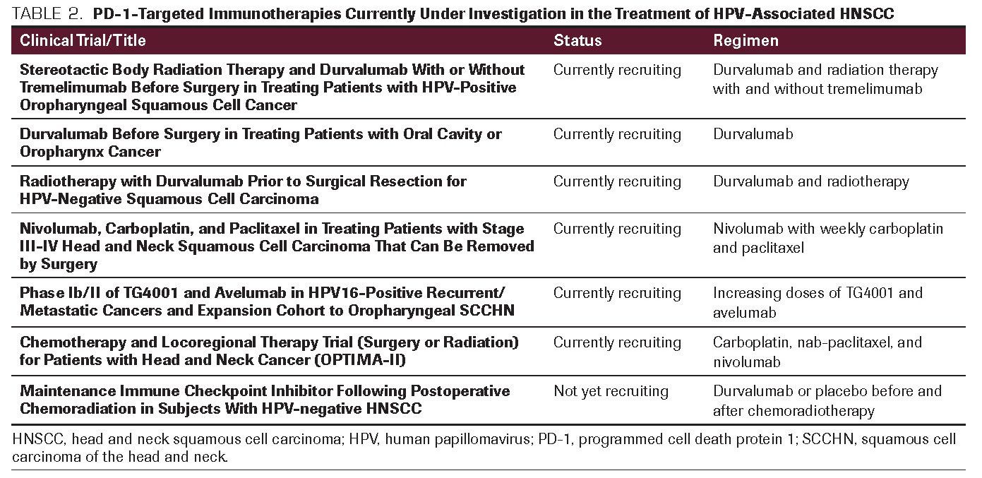 TABLE 2. PD-1-Targeted Immunotherapies Currently Under Investigation in the Treatment of HPV-Associated HNSCC