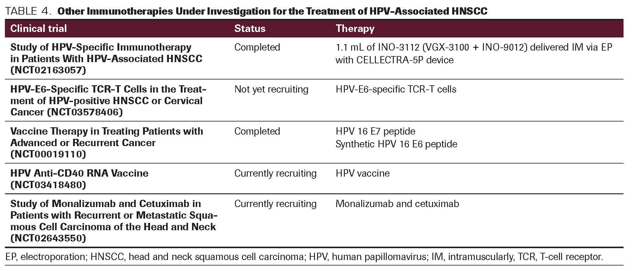 TABLE 4. Other Immunotherapies Under Investigation for the Treatment of HPV-Associated HNSCC