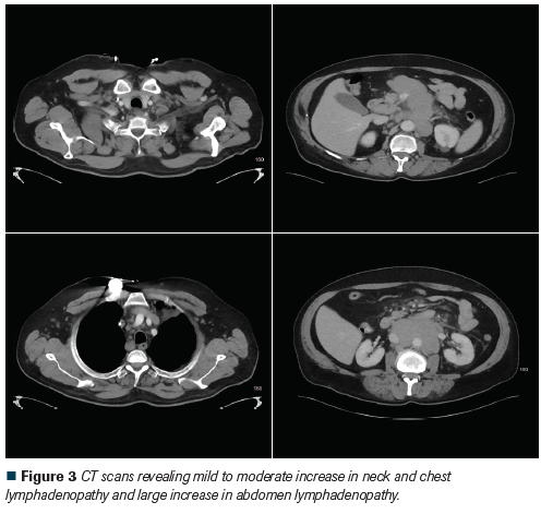 Figure 3 CT scans revealing mild to moderate increase in neck and chest lymphadenopathy and large increase in abdomen lymphadenopathy