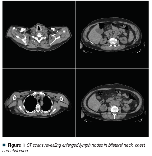 Figure 1 CT scans revealing enlarged lymph nodes in bilateral neck, chest, and abdomen.