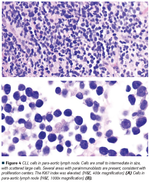 Figure 4 CLL cells in para-aortic lymph node. Cells are small to intermediate in size, with scattered large cells. Several areas with paraimmunoblasts are present, consistent with proliferation centers. The Ki67 index was elevated. (H&E, 400x magnification) (A) Cells in para-aortic lymph node (H&E, 1000x magnification) (B).