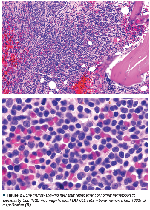 Figure 2 Bone marrow showing near total replacement of normal hematopoietic elements by CLL (H&E; 40x magnification) (A) CLL cells in bone marrow (H&E, 1000x oil magnification (B).