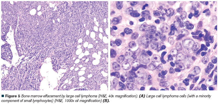 Figure 5 Bone marrow effacement by large cell lymphoma (H&E, 40x magnifi cation). (A) Large cell lymphoma cells (with a minority component of small lymphocytes) (H&E, 1000x oil magnifi cation) (B).