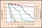 There are two phases of direct cytotoxicty associated with heat exposure.[4] The first phase is one of linear metabolic arrest that represents a period of reversible injury. The second phase is irreversible cytotoxicity and is easier to achieve with increasing temperatures; this more pronounced cytotoxicity is also related to the duration of exposure (Figure). There is a clear dose-response relationship between temperature and cell death, and the transition from the linear to the exponential phase of cytotoxicity occurs more easily at temperatures above 43°C. Although the requisite thermal dose for exponential cell death varies among tumor types, the experimental threshold required for protein denaturation and cell membrane disruption occurs at a dose of 140 kcal/mol.[5,6]
