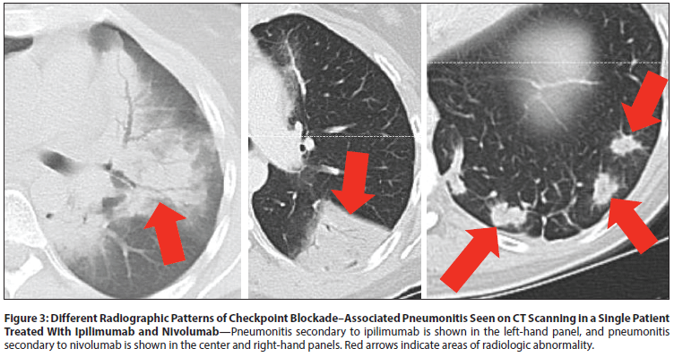 Pneumonitis. In a 306-patient trial of nivolumab, 3 patients died as a result of drug-related pneumonitis.[16] Although it is relatively uncommon, pneumonitis has significant potential for morbidity and mortality, and this condition should be approached with great caution. Optimal evaluation and management of patients with suspected autoimmune pneumonitis has not been assessed in prospective clinical trials, and there is no consensus statement regarding the care of this patient population. In the case of grade 1 pneumonitis (asymptomatic radiographic changes only), immune checkpoint–blockade therapy should be withheld, and patients should be monitored closely (every 2 to 3 days) for the development of symptoms. Consultation with an interventional pulmonologist and an infectious-disease specialist is recommended. Repeat CT imaging of the chest is recommended within 3 weeks to document resolution or progression.