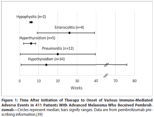 Figure 1: Time After Initiation of Therapy to Onset of Various Immune-Mediated Adverse Events in 411 Patients With Advanced Melanoma Who Received Pembrolizumab