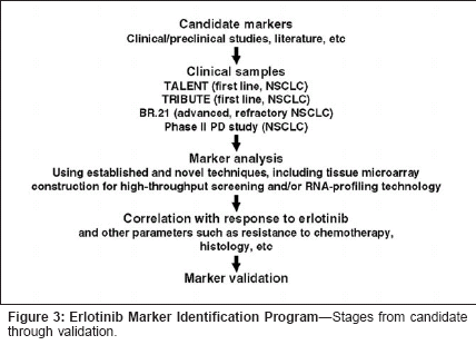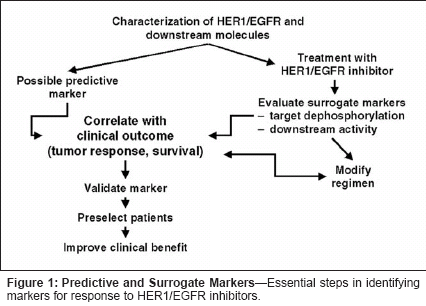 The identification of predictive or surrogate markers of response toHER1/epidermal growth factor receptor (EGFR) inhibitor treatmentwould permit selection of patients most likely to respond to such treatment.Markers could consist of tumor characteristics (eg, characteristicsof the receptor or downstream signaling molecules and determinantsof resistance) or host characteristics (eg, pharmacokinetic parametersand toxicities). The occurrence of rash may constitute a surrogatemarker of response to erlotinib (Tarceva) treatment in patientswith non–small-cell lung cancer and other cancers. The erlotinib markeridentification program has been designed to identify and investigateother candidate markers by analysis of a large number of clinicalsamples from patients enrolled in erlotinib trials in non–small-cell lungcancer, including the phase III TALENT and TRIBUTE trials oferlotinib combined with chemotherapy and the phase III BR.21 trial oferlotinib monotherapy in advanced non–small-cell lung cancer. Thisprogram should both contribute to understanding of the molecular biologyof HER1/EGFR inhibition and result in identification of potentialmarkers that can be evaluated in the clinical setting.