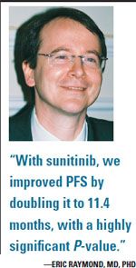 "With sunitinib, we improved PFS by doubling it to 11.4 months, with a highly significant P-value," Dr. Raymond said. "Events occurred in 34.9% on the sunitinib arm vs 60% of the placebo arm."