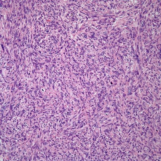 A 73-year-old man presents with a subcutaneous lesion in his right calf. Surgical resection is performed.