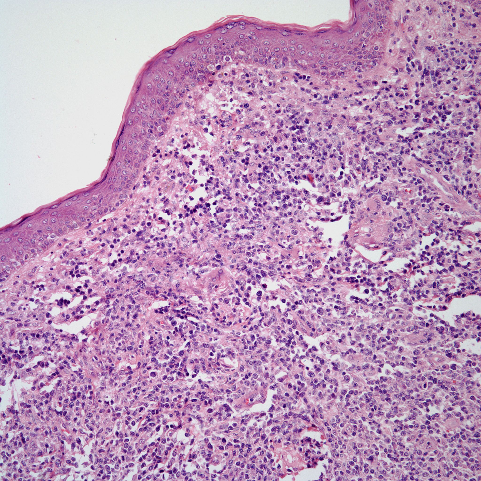 A 57-year-old man presents with a history of pruritic rashes over several areas of the body that have persisted over the last 6 months. Currently the patient has a nodule in the right side of the chest. A biopsy is obtained.