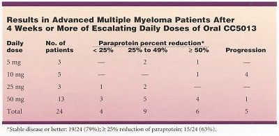 The results of this pilot study confirmed that CC5013 is active and well tolerated. Data showed a 25% or greater reduction in paraprotein in 15 of 24 patients (63%) who have received at least 4 weeks of therapy.