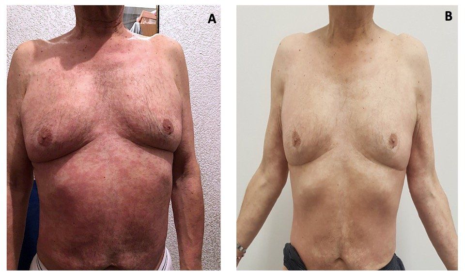 FIGURE 1. Rash Before (A) and After a Systemic Steroid Course (B)