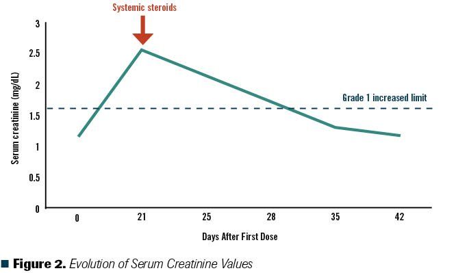 The patient started first-line systemic treatment for intermediate-risk metastatic renal cell carcinoma (mRCC) with combination immunotherapy with nivolumab plus ipilimumab.1 After 10 days of the first cycle, he presented with a pruritic maculopapular rash covering 20% of his body surface (Figure 1A). In consensus with the Dermatology Department, we considered this to be a grade 2 cutaneous immune-related adverse event (irAE) based on the Common Terminology Criteria for Adverse Events (CTCAE).2 He received topical steroids and an oral antihistamine for 1 week; however, due to lack of clinical improvement, the patient was reevaluated and clinical laboratory tests were performed. Results showed a creatinine increase of grade 2 per CTCAE (his baseline creatinine was 1.1 mg/dL, which increased 2.3 times) (Figure 2). Nephrology was consulted for work-up of this acute kidney injury. Urinary tract infection and urinary tract obstruction were ruled out and a bland urinary sediment was found. The patient was diagnosed with tubulointerstitial nephritis related to immune checkpoint inhibitors (ICIs).