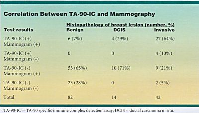 TA-90-IC testing brought the detection rate to 96% of breast cancers (54 of 56) when it was combined with mammography in a prospective study of 138 patients (see table at right). Mammograms were positive for 50 of 56 patients found to have breast cancer at biopsy. TA-90-IC identified four of those who escaped detection by mammography. Only two patients (5%) slipped through both screens.