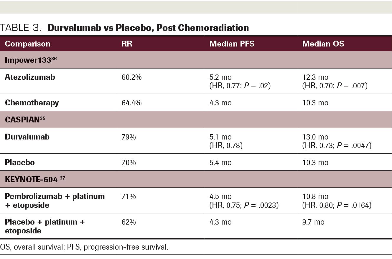 39. Paz-Ares L, Dvorkin M, Chen Y, et al; CASPIAN Investigators. Durvalumab plus platinum–etoposide versus platinum–etoposide in first-line treatment of extensive-stage small-cell lung cancer (CASPIAN): a randomised, controlled, open-label, phase 3 trial. Lancet. 2019;394(10212):1929-1939. doi:10.1016/S0140-6736(19)32222-6