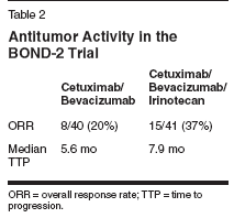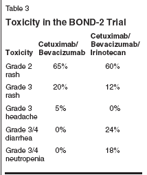 Responses were reported in both arms of the study: 20% with cetuximab/ bevacizumab, and 37% in the irinotecan/cetuximab/bevacizumab arm. The median time to progression was 5.6 and 7.9 months, respectively. Comparison to the results from the BOND study must be limited, but certainly these results suggest the promising antitumor activity of the combination of these targeted agents. Indeed, given the modest activity of bevacizumab as a single agent in this setting, it is possible that combined inhibition of EGFR and VEGF is synergistic, even in the absence of chemotherapy. The toxicity profile of this combination is reasonable (Table 3), and reflects that expected from the combination of theses agents. The frequency of rash was similar to that which would be expected with cetuximab alone. A severe, extensive grade 3 rash was reported in 20% and 12%, respectively, of patients who had received cetuximab/bevacizumab alone or with bevacizumab. The addition of irinotecan resulted in notably more diarrhea and myelosuppression. The patients receiving cetuximab and irinotecan alone did not experience any grade 3 or 4 neutropenia or diarrhea, compared to 18% and 24% of patients who received the addition of cetuximab. One unexpected finding was that 5% of the patients who were treated with the monoclonal antibodies alone developed a severe, grade 3 headache. This event occurred only during the first cycle. This was attributed to a lack of steroid premedication.
