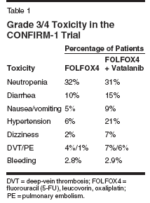 5. Hecht JR, Trarbach T, Jaeger E, et al: A randomized, double-blind, placebo-controlled, phase III study in patients with metastatic adenocarcinoma of the colon or rectum receiving first-line chemotherapy with oxaliplatin/5-fluo- rouracil/leucovorin and PTK787/ZK222584 or placebo (CONFIRM-1) (LBA abstract 3). J Clin Oncol 23(16S):2s, 2005.