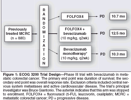 The treatment of colorectal cancer has truly undergone a dramatic revolution over the past 4 to 5 years. When one thinks back to a "5-FU-only" world-where the median survival of patients with metastatic colon cancer was on the order of 10 to 12 months and the benefit of adjuvant therapy was modest at best-and compares that to the world today, where we are relatively rich with therapeutic options, it is at times overwhelming. Even for those of us who are focused entirely on the management of gastrointestinal oncology, it is difficult to determine the best options for patients and if there truly are standards of care for patients with colorectal cancer. As we have evolved with the incorporation of new chemotherapy medicines, and now with new effective monoclonal antibodies, we have gone from a world of having single choices to having multiple choices for our patients accompanied by clear success, with median survivals now approaching 3 years. The focus of this article is to summarize some of the key advances of incorporating biologically targeted therapies into the routine management of patients with colorectal cancer. We will review the key findings from the 2005 American Society of Clinical Oncology (ASCO) annual meeting, and comment on our incorporation of these data into the management of our patients on a day-to-day basis. FOLFOX and Bevacizumab: ECOG 3200 When the pivotal trial of bevacizumab (Avastin) was designed for colorectal cancer, the standard of care was the irinotecan (Camptosar)/bolus fluorouracil (5-FU) regimen known as IFL. However, by the time the trial was reported, the standard of care in the United States and much of the world was the use of either FOLFOX (5-FU, leucovorin, oxaliplatin [Eloxatin]) or FOLFIRI (5-FU, leucovorin, irinotecan) as front-line treatment for metastatic colon cancer. Fortunately, the US Food and Drug Administration (FDA) approval of bevacizumab allowed for the incorporation of this agent into any intravenous 5-FU regimen for colorectal cancer. Interestingly, even though there were significant safety data in breast cancer combining bevacizumab with capecitabine (Xeloda), the specific indication was with intravenous 5-FU. Despite the lack of data combining bevacizumab with a FOLFOX regimen, the majority of US oncologists chose to incorporate bevacizumab with FOLFOX in front-line metastatic disease; this was done on the solid assumption that if bevacizumab improves the outcome with IFL, then the incorporation with the superior regimen using infusional 5-FU and either oxaliplatin or irinotecan would offer further improvements. The Eastern Cooperative Oncology Group trial ECOG 3200 is an important randomized clinical trial that demonstrated the benefit of adding bevacizumab to FOLFOX4 chemotherapy.[ 1] However, it is important to recognize that this study was done in second-line metastatic colorectal cancer patients who had previously received an irinotecan-based chemotherapy. As shown in Figure 1, the randomization of this trial was between FOLFOX4, FOLFOX4 plus bevacizumab at 10 mg/kg, and bevacizumab alone at 10 mg/kg.