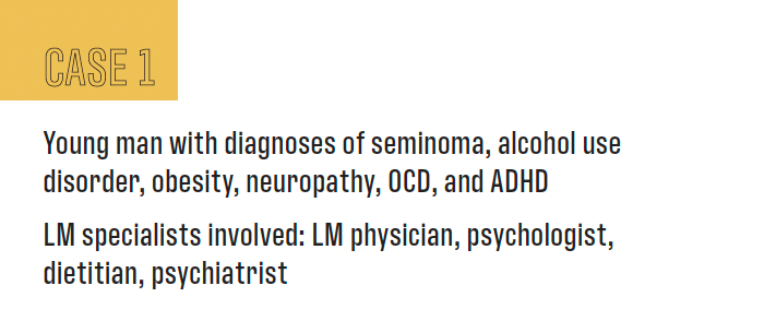 The 2 patient cases presented here demonstrate the benefits of incorporating broad and diverse LM tools in oncology supportive care. Both patients benefited from a multidisciplinary approach with a focus on education about the 6 pillars of LM and coaching to help them with behavior change. Case 1 focused on a 33-year-old man with stage IIIC seminoma. At the conclusion of his aggressive treatment, he had no evidence of disease. However, he had numerous other medical issues that needed to be addressed in the survivorship phase of his care to reduce his risk of future health complications. His referral to the LM clinic enabled him to access a multidisciplinary team that offered expertise in behavioral health so he could address his alcohol use disorder, weight, neuropathy, OCD, and ADHD.