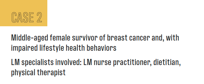 Case 2 focused on a 46-year-old woman with a history of early-stage, estrogen receptor–positive, HER2-positive breast cancer and localized melanoma. Due to the demands of treatment for her breast cancer, and other stressors, she had moved away from her prior commitment to a healthy diet and regular physical activity, and she noted severe fatigue and difficulty readopting healthy lifestyle behaviors. Her referral to the LM clinic enabled her to access a different scope of the multidisciplinary team, which included expertise in nutrition and physical therapy, as well as the LM Group Visit Program, so she could develop her own SMART goals and improve her health behaviors.