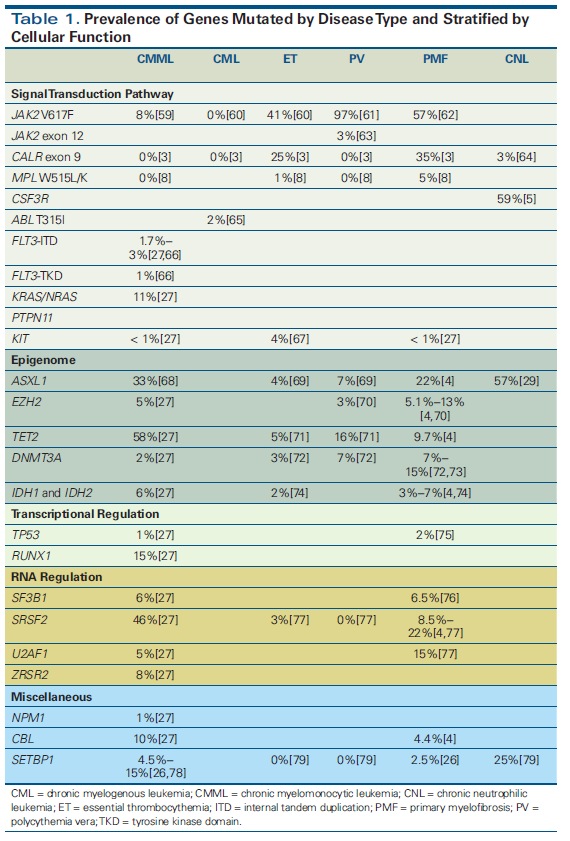 69. Brecqueville M, Rey J, Bertucci F, et al. Mutation analysis of ASXL1, CBL, DNMT3A, IDH1, IDH2, JAK2, MPL, NF1, SF3B1, SUZ12, and TET2 in myeloproliferative neoplasms. Genes Chromosomes Cancer. 2012;51:743-55.