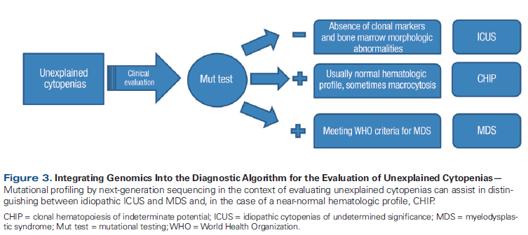 As genomic information is becoming increasingly relevant, there is heightened interest in novel assays to detect a variety of alterations. Recently, a novel comprehensive genomic profiling assay of DNA and RNA became available. It is able to detect a variety of clinically relevant genetic alterations (substitutions, insertions/deletions, copy number alterations, and a wide range of gene fusions) in hematologic malignancies.[54] However, with improvements in the quality and availability of mutation profiling, additional mutations are being discovered whose clinical relevance is unclear. One example of this is clonal hematopoiesis of indeterminate potential (CHIP). This newly coined entity is best defined as the presence of somatic mutations in hematologic malignancy–associated genes in blood or bone marrow cells in the absence of cytopenias or hematologic malignancy, or in patients with cytopenias that do not meet the strict criteria for WHO-defined myelodysplastic syndromes. In a patient with unexplained cytopenias, mutation profiling can provide diagnostic assistance (Figure 3). The mutated allele frequency must be > 2% to qualify for the CHIP diagnosis. Compared with myelodysplastic syndromes, CHIP is associated with longer survival and normal blood counts in most cases.[55] The most commonly mutated genes appear to be TET2 and DNMT3A, and the mutations are highly age-correlated.[56] The rate of progression to acute myeloid leukemia is low, at 0.5% to 1% per year, similar to the rate of progression in patients with monoclonal gammopathy of undetermined significance, although higher than in those without known mutations. Guidelines are currently nonexistent for the management of patients in this category. It is proposed that patients in whom mutations are discovered undergo routine surveillance, as in monoclonal gammopathy of undetermined significance, if hematologic abnormalities are present. For clinicians, the counseling and management of patients with CHIP will be an ongoing challenge, but the potential for early intervention in some patients is promising.