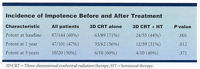 Dr. Chen reported that 1 year after 3D CRT, 47% (47 of 101 patients) were totally potent, compared with 60% (87 of 144 patients) before treatment (see Table). The percentage increased slightly to 50% (10 of 20) among those who had at least 3 years of follow-up.