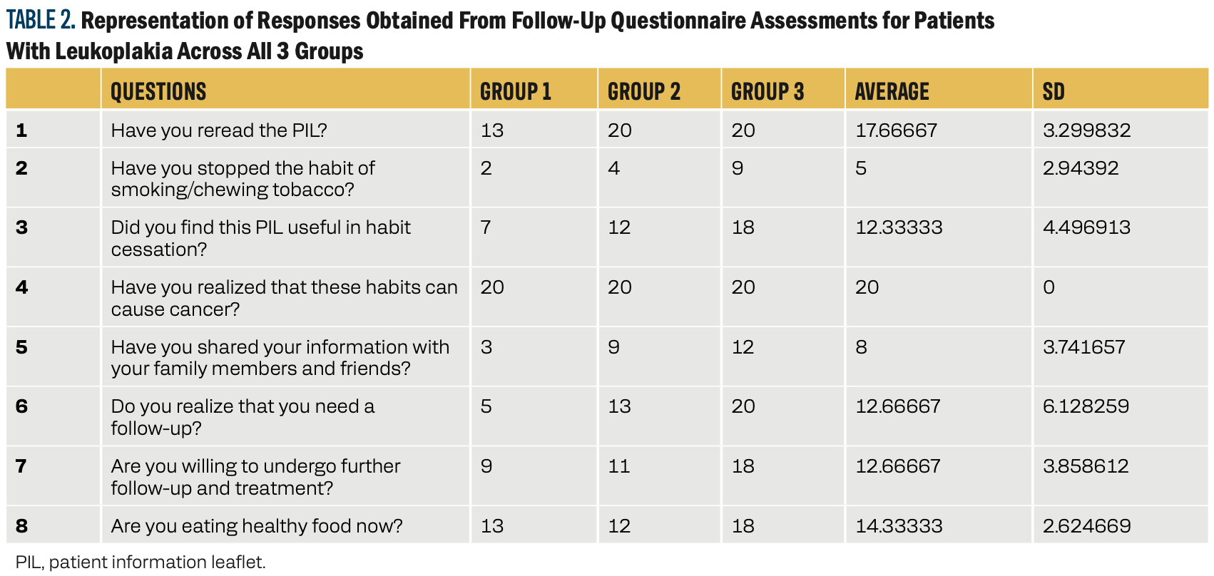 TABLE 2. Representation of Responses Obtained From Follow-Up Questionnaire Assessments for Patients With Leukoplakia Across All 3 Groups