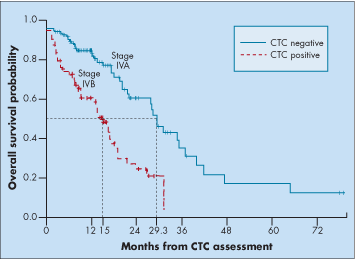 Among the 28% of patients with newly diagnosed and untreated metastases, the CTC-positive subset had significantly poorer overall survival than the CTC-negative subset (15 vs 29.3 months) (see Figure).