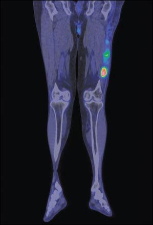 FDG-PET/CT fusion image of the legs, frontal section, showing liposarcoma of the left thigh. Liposarcoma is a malignant tumor that develops in deep soft fatty tissue.