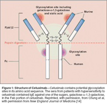 A recent report clarified this issue in the case of cetuximab by demonstrating that a majority of patients experiencing severe hypersensitivity reactions to cetuximab had detectable levels of IgE against the fragment antigen binding (Fab) portion of cetuximab in pretreatment sera.[14] The fact that the IgE was present in patients with no previous exposure to cetuximab suggested the presence of preexisting IgE that cross-reacts with cetuximab. Further study showed that the cetuximab cross-reacting IgE binds to a specific sugar moiety, galactose-α-1,3-galactose oligosaccharide, present on the Fab portion of cetuximab (Figure 1).[14] In fact, the culprit behind the creation of the specific carbohydrate moiety is actually the cell line in which cetuximab is produced; an SP2/0 mouse myeloma cell line, rather than the traditional Chinese hamster ovary cell used for production of many therapeutic monoclonal antibodies.[14]
