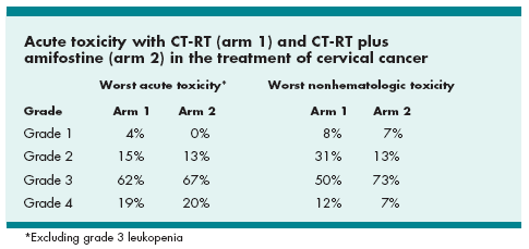 The cytoprotective agent amifostine (Ethyol) did not reduce the rate of acute severe toxicity among patients undergoing combined radiation therapy and chemotherapy for locally advanced cervical cancer, according to a phase I/II study reported at ASTRO 2007 (abstract 10). The trial, RTOG 0116, enrolled women with cervical cancer who had evidence of positive para-aortic or high common iliac nodes.
