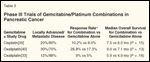 Several investigations combining platinum compounds with gemcitabine have also been reported for advanced pancreatic cancer (Table 3). In 2003, Heinemann et al reported a randomized, phase III study in 195 patients comparing 28-day cycles of either gemcitibine at 1,000 mg/m2 with cisplatin at 50 mg/m2 on days 1 and 15 or gemcitabine at 1,000 mg/m2 on days 1, 8, and 15. Median overall survival was 7.5 months in the combination arm vs 6.0 months in the single-agent gemcitabine arm. This was not a statistically significant difference.[39]