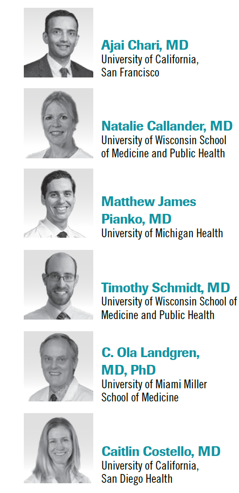 Additional panelists include Natalie Callander, MD, director of the University of Wisconsin Carbone Cancer Center Myeloma Clinical Program and faculty member in the Division of Hematology, Medical Oncology and Palliative Care within the Department of Medicine; Matthew James Pianko, MD, clinical assistant professor at University of Michigan Health; Timothy Schmidt, MD, assistant professor at the University of Wisconsin School of Medicine and Public Health; C. Ola Landgren, MD, PhD, professor of medicine, chief of the Division of Myeloma in the Department of Medicine, director of the Sylvester Myeloma Institute, coleader of the Translational and Clinical Oncology Program, and Paul J. DiMare Endowed Chair in Immunotherapy at the University of Miami Miller School of Medicine; and Caitlin Costello, MD, associate professor of medicine at University of California, San Diego Health.