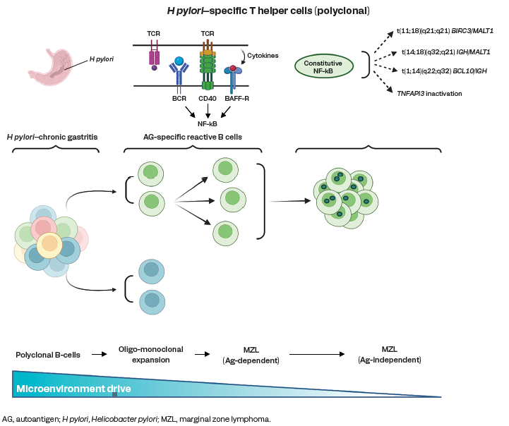 This depicts the progression from polyclonal B cells to oligomonoclonal expansion, leading to antigen-dependent MZL and eventually antigen-independent MZL. The role of H pylori infection in chronic gastritis is illustrated, emphasizing the interaction between H pylori–specific T helper cells, B cells, and the activation of pathways such as NF-B via antigen stimulation (eg, CD40/CD40L interactions and cytokines such as BAFF). The figure also notes genetic alterations (eg, translocations involving MALT1, IGH, and BCL10, as well as TNFAIP3 inactivation) that contribute to constitutive NF-B signaling, underscoring the transition to antigen-independent lymphoma development