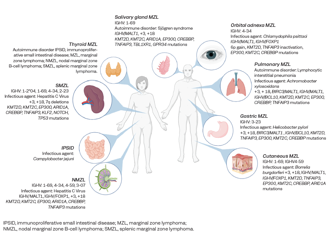 This figure illustrates the anatomical distribution, molecular characteristics, and associated triggers of various subtypes of MZL.