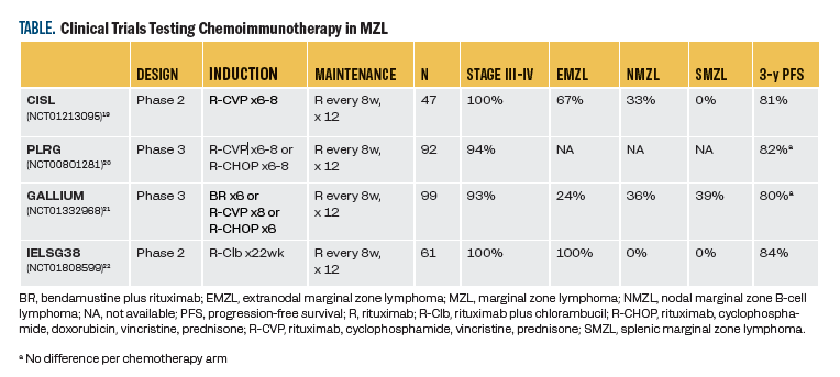 To kick off the discussion of clinical trials, Izidore S. Lossos, MD, professor of medicine, chief of the Lymphoma Section at the Division of Hematology, endowed director of the Lymphoma Program, and head of Lymphoma Site Disease Group at the University of Miami Sylvester Comprehensive Cancer Center, provided an overview of the clinical trials in North America (Table). Lossos began with an overview of research needs in MZL treatment, for which there is no established standardized approach. Patients have lengthy survival and some do not require treatment, but the criteria for treatment initiation are based on those for FL and are not applicable to many patients with extranodal and splenic MZL. Only 1 randomized trial has been performed in the rituximab era in patients with extranodal MZL, so treatment guidelines are based on large institutional experiences.