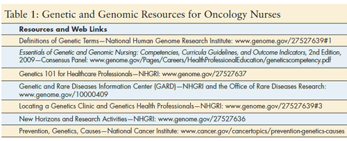 ABSTRACT: Abstract Genetic and genomic research discoveries are ushering in a new era of healthcare-personalized healthcare, which can potentially transform healthcare through earlier diagnosis and more effective risk assessment and cancer risk management. It may also inform optimal drug selection and limit drug side effects. This has important implications for oncology nursing practice throughout the cancer care continuum. In recognition of the expanding role of genetics and genomics in nursing practice, the Essentials of Genetic and Genomic Nursing was first published in 2006 by an independent consensus panel of nursing professionals. This resource is now in its second edition. As the consensus panel notes, genetic and genomic information will be utilized increasingly for prevention, screening, diagnosis, assessment of prognosis, selection of treatment, and monitoring of disease. This article, founded on the Essentials of Genetic and Genomic Nursing, describes the integration of genetics and genomics into oncology nursing practice, highlighting ways that new information and understanding in this area have advanced the management of patients at risk for or diagnosed with cancer.Click here to link to the CME post-test for this article.