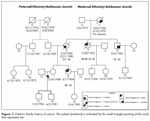 Genetic Education, Counseling, and Nursing Management. After completing her pedigree (Figure 1), you tell her you will share her family history with the oncology care team. Following a discussion with the oncology care team, you and the oncologist talk with the patient about her family history. You tell her that her family history suggests hereditary breast/ovarian cancer associated with mutations in the BRCA1 and BRCA2 genes, which are transmitted in an autosomal dominant pattern. You also let her know that individuals who are of Ashkenazi Jewish ancestry have a higher chance of having an inherited susceptibility to breast and ovarian cancer.[30] You recommend a referral to a genetics specialist who can evaluate her personal and family history and talk with her in detail about genetic testing for mutations in BRCA1 or BRCA2. The patient agrees to see the genetic specialist, and you make the referral that day.