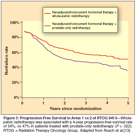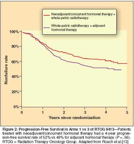 Optimal Timing of Hormonal Therapy Should hormonal therapy be given adjuvantly or neoadjuvantly? RTOG 9413 was the first phase III prospective randomized trial to stratify patients by PSA, Gleason score, and TNM stage, and to use progressionfree survival (biochemical failure and clinical failure) as a primary end point. Using hormonal therapy in the form of androgen blockade, the trial randomized patients to treatment arms that included whole-pelvic radiotherapy and neoadjuvant/concurrent hormonal therapy, prostate-only radiotherapy and neoadjuvant/concurrent hormonal therapy, whole-pelvic radiotherapy plus adjuvant hormonal therapy, and prostate-only radiotherapy plus adjuvant hormonal therapy.[ 13] RTOG 9413 not only addressed the timing of hormonal therapy, it also demonstrated the importance of whole-pelvic radiotherapy when using hormonal therapy.