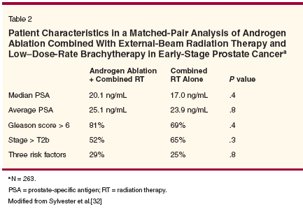 The MSKCC investigators also assessed 263 patients between 1992 and 1997 who had prostates weighing more than 60 g and were given neoadjuvant hormonal therapy for cytoreduction (Table 2). A retrospective matched-pair analysis was unable to show any benefit with neoadjuvant hormonal therapy plus permanent prostate implants, compared with permanent prostate implants alone.[27]