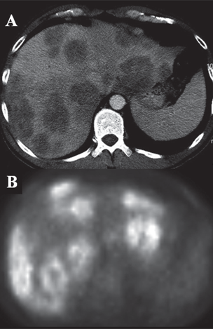 Patient with extensive hepatic colorectal metastases on CT (A) and FDG-PET (B)