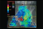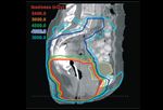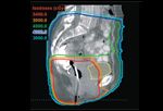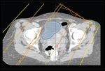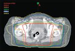 Figures 2 through 5 compare a 3D conformal radiation therapy plan (Figures 2 and 4) with an IMRT-based treatment plan (Figures 3 and 5). Figures 6 and 7 illustrate a representative IMRT field with associated dose fluence map. The differences in sagittal radiation dose distribution are shown between a 3D conformal plan (Figure 8) vs IMRT plan (Figure 9). A clinically significant advantage of IMRT includes a reduction in normal (high-dose) tissue irradiation resulting in less acute and chronic radiation-related toxicities, including nontarget bowel, bladder, and genitalia. These can often be significant using conventional radiation techniques, leading to potential treatment breaks with poor outcomes. Additionally, IMRT may permit safe radiation dose escalation in selected clinical situations.